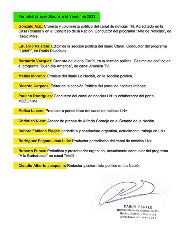 En otra de las puntas del ovillo este diario obtuvo la Nota 2023-01430348-GDEMZA-EMETUR, firmada por el propio Sarale el 27 de febrero pasado, en la que el poderoso secretario de Comunicación Social, Prensa y Protocolo del Gobierno de Mendoza, solicitó a Turismo que contrate una lujosa cena para agasajar a “periodistas acreditados a la Vendimia 2023”. Entre los que se encuentran Gonzalo Azis (TN), Eduardo Paladini (Clarín), Bernando Vázquez (Clarín), Matías Moreno (La Nación), Ricardo Carpena (Infobae), Paulino Rodríguez (LN+), Melisa Lucero (LN+), Débora Fabiana Plager (LN+), José Luis Rodríguez Pagano (LN+), “Robertito” Funes (Telefé), Claudio Alberto Jacquelin (La Nación) y el empleado del Senado de la Nación y asesor del senador nacional Alfredo Cornejo, Christian Nieto.
