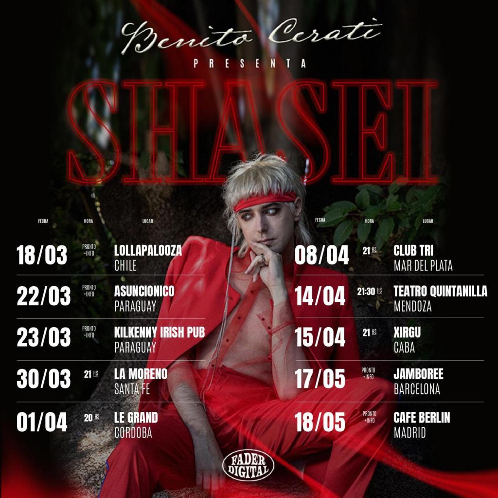 Benito Cerati inicia la gira presentación de su nuevo disco «Shasei». El inicio del tour será con un show en el Lollapalooza Chile, brindará dos presentaciones en Paraguay (Festival Asunciónico y un side show), visitará algunas de las ciudades más importantes de Argentina (Santa Fé, Córdoba, Mar del Plata Mendoza), y el cierre de la gira tendrá lugar en el Teatro Xirgu UNTREF, para luego partir a España, donde visitará Barcelona y Madrid.