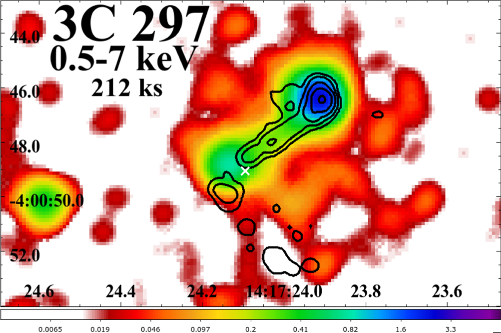 Imagen de Chandra de 3C 297, obtenida tras fusionar las observaciones disponibles, para un total de 212 ks. La imagen se ha filtrado en el rango de energía de 0,5 a 7 keV, se ha agrupado con un tamaño de píxel de 0farcs123 píxel−1 ​​y se ha suavizado con un kernel gaussiano de 3farcs44. VLA 8,4 GHz (haz de restauración 0farcs357 × 0farcs233) se dibujan contornos de radio negros a partir de 0,08 μJy haz−1, aumentando en factores de 6. La posición del núcleo de radio, derivada del mapa de índice espectral, está marcada con una cruz blanca.