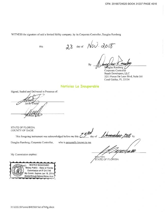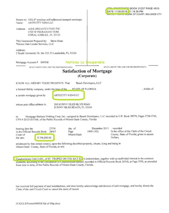 Como puede apreciarse en la documentación que presentamos a continuación en exclusiva, la deuda de la hipoteca fue saldada en su totalidad a fines de 2018 por ARTECITY N204 LLC.