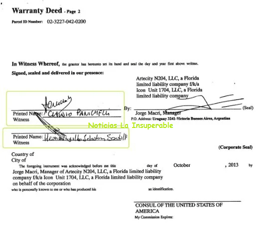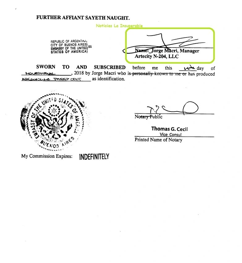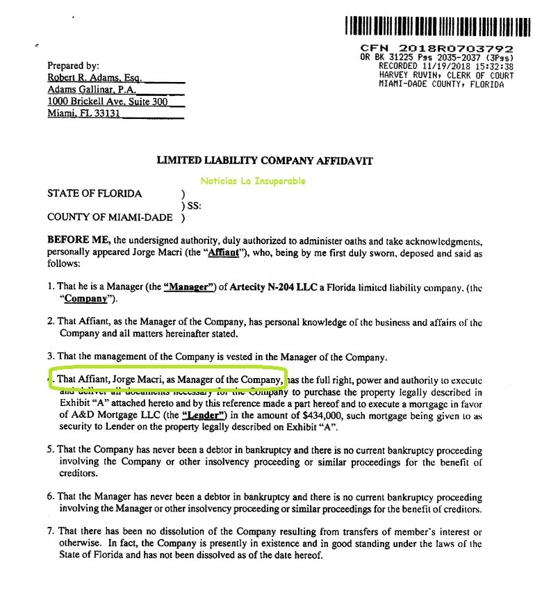 Y para que no queden dudas de a quien pertenece ARTECITY, el mismo Jorge Macri firma en Miami en noviembre de 2018 la documentación que lo vincula a dicha empresa como “Manager”.