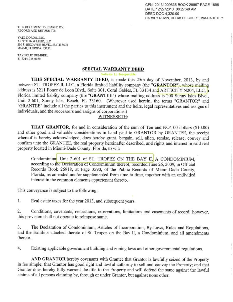 A continuación, el artículo especifica que el último departamento adquirido por Artecity en noviembre de 2013 es la Unidad 2-601 en St Tropez On the Bay II, valuado en 720.000 dólares y para el que sacó una hipoteca en esa moneda por 396.000 (del que hicimos mención y mostramos -en exclusiva- más arriba).