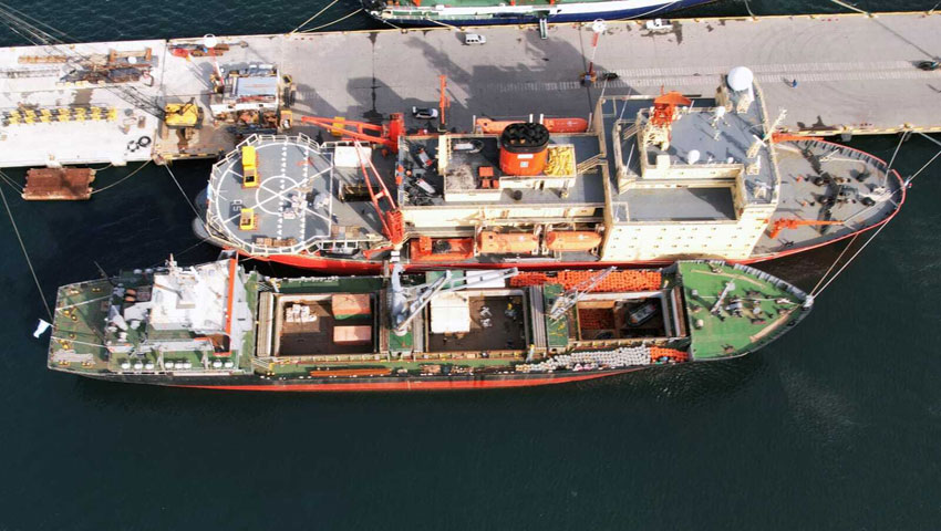 Sorteando las condiciones de mar propias de esta época del año en el Atlántico Sur, el ARA “Canal Beagle” logró en la madrugada del sábado pasado amadrinarse (amarrarse al costado) al rompehielos y comenzar sin demoras el traspaso de más de 250.000 kg de carga general (materiales de construcción, pinturas, amoblamientos del laboratorio antártico multidisciplinario, etc.); 120.000 litros de combustible (gasoil antártico, tubos de gas, etc.) y 40.000 kg de víveres (secos, refrigerados y frigorizados).