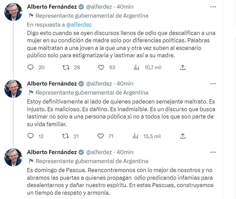 Vía Twitter, el mandatario dijo que la Pascua es una oportunidad «para repensar lo vivido» y «construir un futuro distinto» donde se respete «la diversidad». «Digo esto cuando se oyen discursos llenos de odio que descalifican a una mujer en su condición de madre solo por diferencias políticas. Palabras que maltratan a una joven a la que una y otra vez suben al escenario público solo para estigmatizarla y lastimar así a su madre», escribió Fernández.