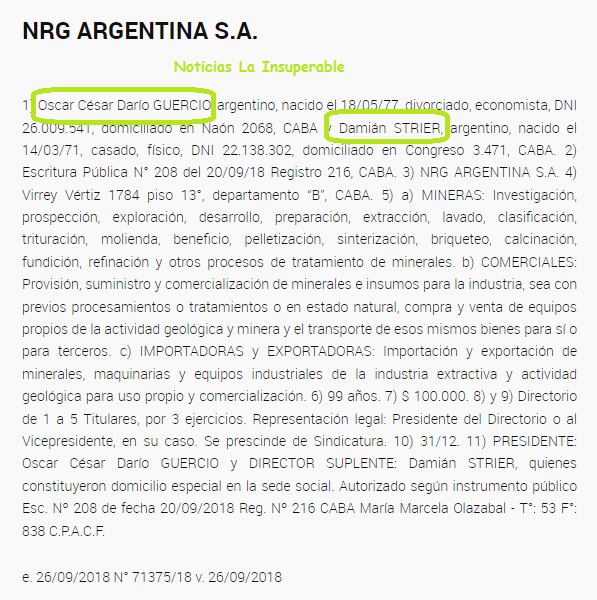 NRG Argentina, es una empresa conformada en 2018 por el economista Oscar César Darío Guercio y el físico Damián Stirer, una compañía proveedora de arena para fracking ubicada en Río Negro, con destino Vaca Muerta. La arena es un insumo clave porque estimula los pozos y genera caminos que permiten que fluyan los recursos energéticos, mientras mantienen abiertas las fracturas creadas en la estimulación.