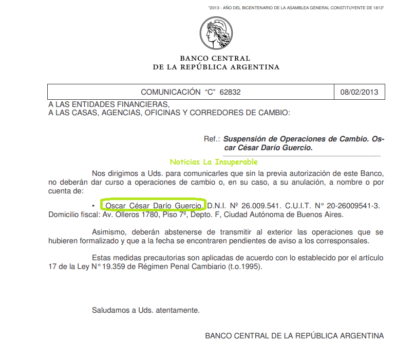 Guercio ya cuenta con antecedentes de operaciones «non sanctas» como cuando fue suspendido en 2013 para realizar operaciones de Cambio por el Banco Central.