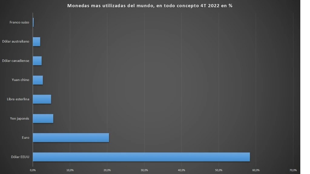 Y la presidenta del Banco Central europeo tiene razón, es decir, las cuatro monedas más importantes del mundo, dólar americano, euro, libra esterlina y yen japonés, siguen manteniendo más del 90% de las transacciones y reservas de valor. También es evidente que parte de las reservas en dólares estadounidenses de los bancos centrales se ha reducido en 12 puntos porcentuales desde el cambio de siglo, del 71% en 1999 al 58.4% en cuarto trimestre del 2022.