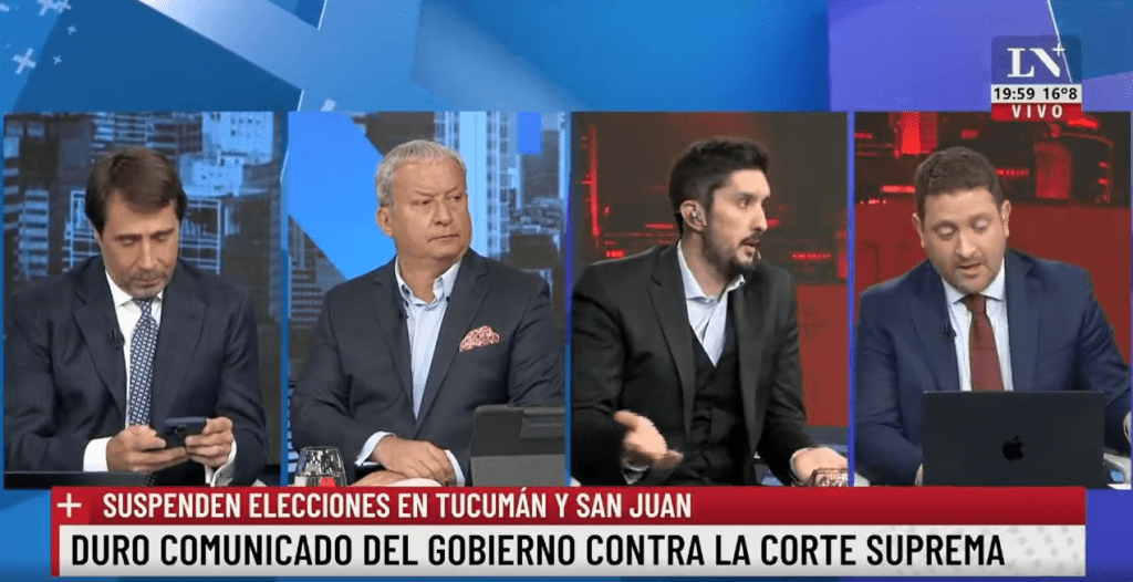 Durante el pase del programa que conduce, compartiendo mesa con Jonatan Viale, el periodista de LN+, Eduardo Feinmann, indicó que la Corte Suprema de Justicia de la Nación recibió indicaciones para suspender las elecciones en San Juan y Tucumán.