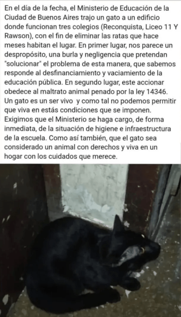 Diferentes escuelas porteñas que sufren la presencia de roedores, para su sorpresa y estupor, recibieron gatos. “Hace varios meses que estamos reclamando la presencia de ratas en la escuela, más precisamente desde noviembre del año pasado. Hicimos múltiples pedidos, elevamos las actas correspondientes para que desraticen. Pusieron cebos y trampas pero las ratas siguen más presentes que nunca”, relata a los medios Lisandro Rappetti, docente de la escuela N° 16 Guillermo Rawson, emplazada en pleno barrio de Villa Urquiza. Como en el resto de las escuelas que denunciaron la presencia de esta plaga, los estudiantes se sienten inseguros y consideran que no pueden seguir yendo a clases en estas condiciones. “Ayer se cumplieron dos semanas que las clases se dictan de manera discontinua, de manera reducida, muchos días firmamos actas y nos vamos porque las ratas están por todos lados. Cuál fue la solución que encontró el ministerio de Educación para desratizar la escuela: traer un gato negro”, señala Rappetti.
