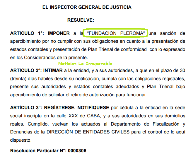 Pues bien, la Fundación Pléroma parece estar «floja de papeles». Así por lo menos lo determinó la Inspección General de Justicia (IGJ) hace unas semanas. A través de la Resolución Particular 306/2023, a la que accedió Noticias La Insuperable, el organismo comandado por Ricardo Nissen le impuso «una sanción de apercibimiento por no cumplir con sus obligaciones en cuanto a la presentación de estados contables y presentación de Plan Trienal«.