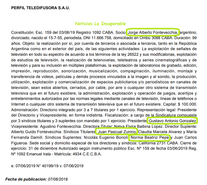 A su vez, el Consejo Consultivo del mencionado fideicomiso, estaría compuesto por Juan Pascual Zunino, Norma Beatriz Pepe y Gustavo Antonio González, todos integrantes de la firma PERFIL TELEDIFUSORA SAU, una sociedad unipersonal constituida por Jorge Fontevecchia en junio de 2019.