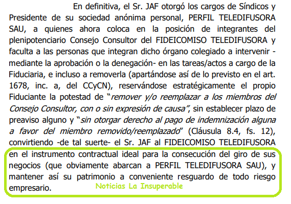 Pero lo que termina de poner el broche de oro es que, por un lado, los miembros ya mencionados del Consejo Consultor, a su vez con cargos en PERFIL TELEDIFUSORA SAU (cuyo capital social –en un ciento por ciento- constituye el patrimonio fideicometido de FIDEICOMISO TELEDIFUSORA), estarían autorizados a intervenir en las tareas/actos a cargo de la Fiduciaria, e incluso a removerla, reservándose a su vez, el propio Fiduciante, o sea Jorge Fontevecchia, el derecho a remover sin causa ni indemnización a los miembros del Consejo Consultivo, dando claras muestras de que todo el fideicomiso es una fachada, convertido «en el instrumento contractual ideal para la consecución del giro de sus negocios (que obviamente abarcan a PERFIL TELEDIFUSORA SAU), y mantener así su patrimonio a conveniente resguardo de todo riesgo empresario«.
