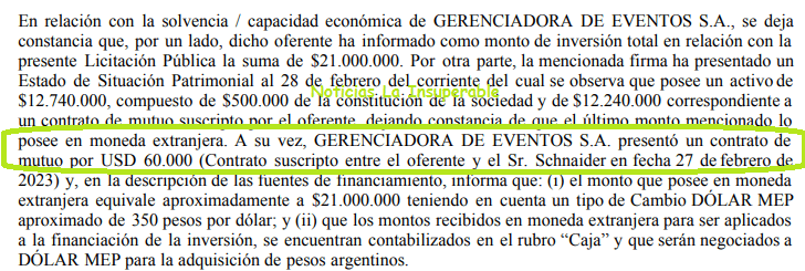 Allí, documentación expuesta, el periodista demuestra como los socios de la empresa, sin historial de aval para ganar una licitación de tal magnitud, presenta un «mutuo» firmado por los empresarios Carlos Daniel Lowenstein y Gastón Maizlisz, que serían las verdaderas caras ocultas detrás de la empresa y que no son otros que los dueños de Salguero Eventos SA, «una empresa muy familiar para el macrismo: uno de sus accionistas fue Fernando Polledo Olivera, esposo de la exlegisladora y exdiputada, Carmen Polledo, hoy funcionaria porteña del gabinete de Larreta«.