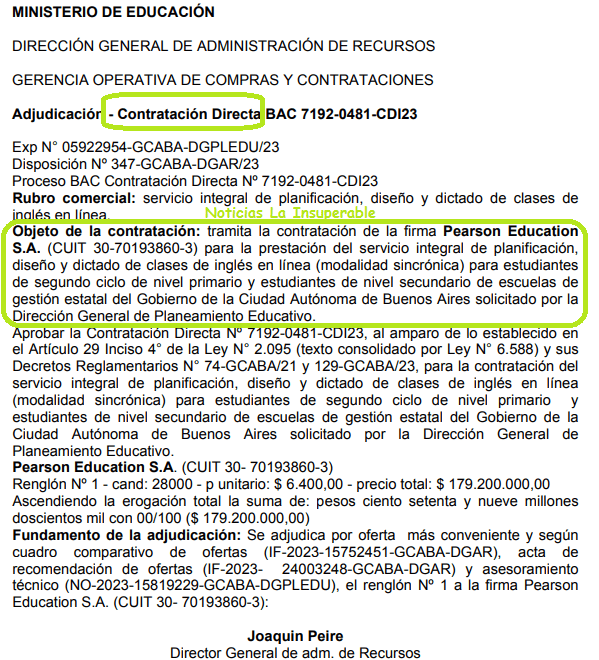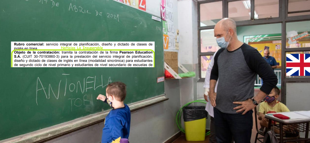 A través de una Contratación Directa BAC 7192-0481-CDI23, el gobierno de la Ciudad de Buenos Aires que encabeza el precandidato presidencial Horacio Rodríguez Larreta, acaba de privatizar parte de la educación pública. Con la firma de Joaquín Peire, Director General de Administración de Recursos del ministerio de Educación porteño, se contrató a la firma Pearson Education S.A. para brindar el servicio integral de planificación, diseño y dictado de clases de inglés en línea (modalidad sincrónica) para estudiantes de segundo ciclo de nivel primario y estudiantes de nivel secundario de escuelas de gestión estatal del Gobierno de la Ciudad Autónoma de Buenos Aires, tal cual lo solicitado por la Dirección General de Planeamiento Educativo de CABA.