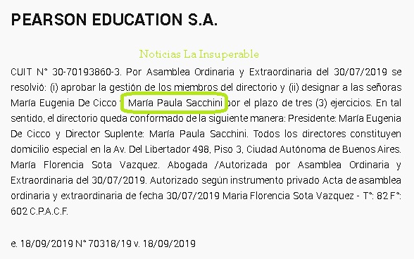 En el mismo rubro, Sacchini integra el directorio de la editorial Pearson Education S.A. y, actualmente, es cabeza del departamento de Marketing de Pearson English USA.