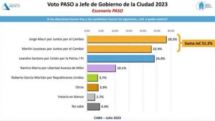 Según la encuestadora, Jorge Macri ganaría la interna frente a Lousteau, al obtener 28,3 por ciento de los sufragios y quedaría como el candidato más votado. A Ramiro Marra, del bloque ultraderechista de Javier Milei, los sondeos lo sitúan en cuarto lugar, con apenas el 10 por ciento de los votos.