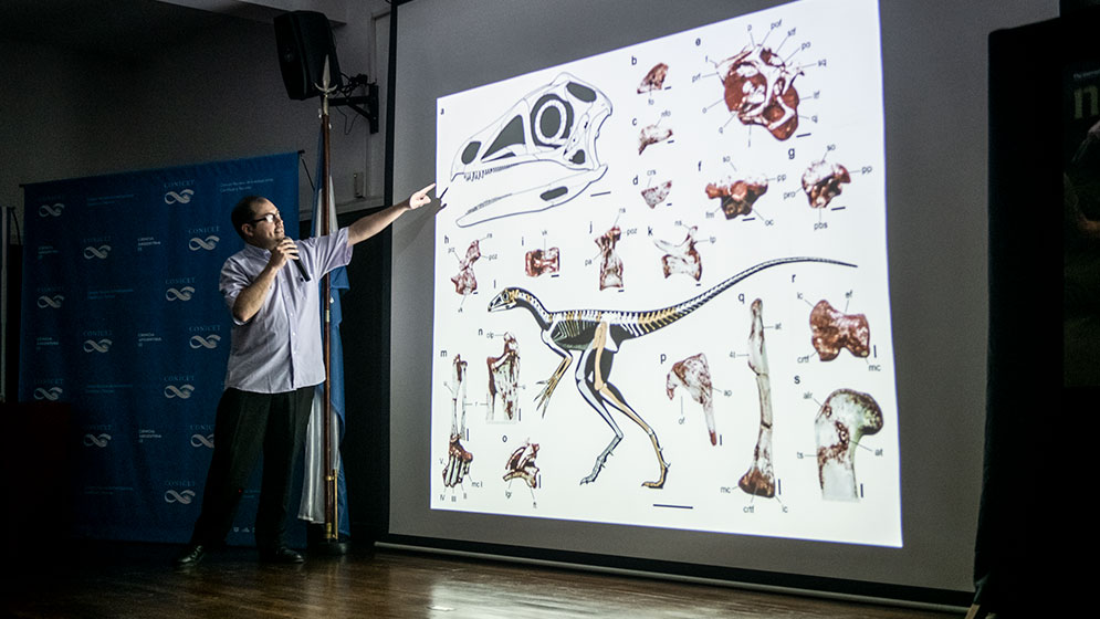 El hallazgo paleontológico se presentó en el Museo de Ciencias Naturales “Bernardino Rivadavia”. Allí los paleontólogos del CONICET Federico Agnolín y Martín Ezcurra explicaron los alcances del descubrimiento y presentaron una reconstrucción del esqueleto del ejemplar.