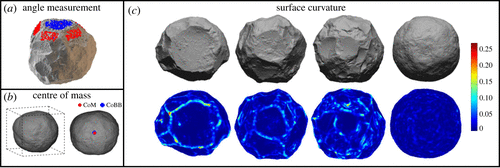 Métodos de medición de ángulos de bordes, centro de masa y curvatura de superficies. (a) El método para calcular ángulos en los esferoides, utilizando la función Ángulo entre superficies del programa Artifact3-D. Los puntos rojo y azul representan coordenadas que comprenden el cálculo de ángulos en dos superficies diferentes. (b) Un cuadro delimitador mínimo de un esferoide de ejemplo (líneas discontinuas), así como la ubicación de su centro de masa (CoM; círculo rojo) y el centro del cuadro delimitador (CoBB; cruz azul). (c) Valores de curvatura de la superficie mostrados con mapas de calor de esferoides de ejemplo. Las regiones de mayor curvatura se muestran en colores más brillantes.