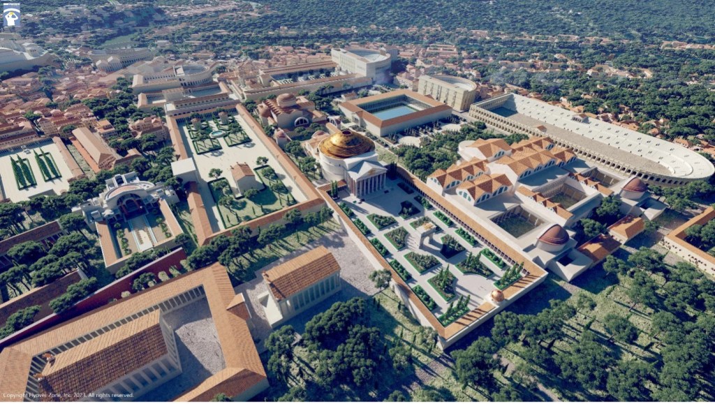 El modelo digital ofrece varios vuelos turísticos sobre toda la antigua Roma. A vista de pájaro, se sobrevuelan famosos edificios del centro histórico, de los que en la Roma actual solo pueden verse ruinas y restos. Estos se pueden ver en su totalidad en la maqueta. Entre ellos se encuentran el Coliseo, el Circo Máximo, el Panteón y el Foro Romano. Los expertos explican las particularidades.