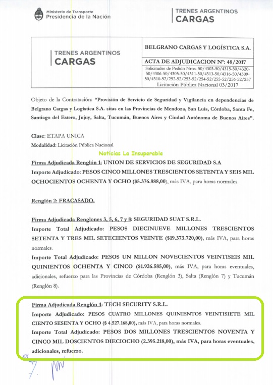 Y también, por qué no, negocios a nivel nacional. Como cuando durante la presidencia de Mauricio Macri, el Belgrano Cargas, en 2017 le adjudicó casi 7 millones por servicios de Seguridad y Vigilancia.