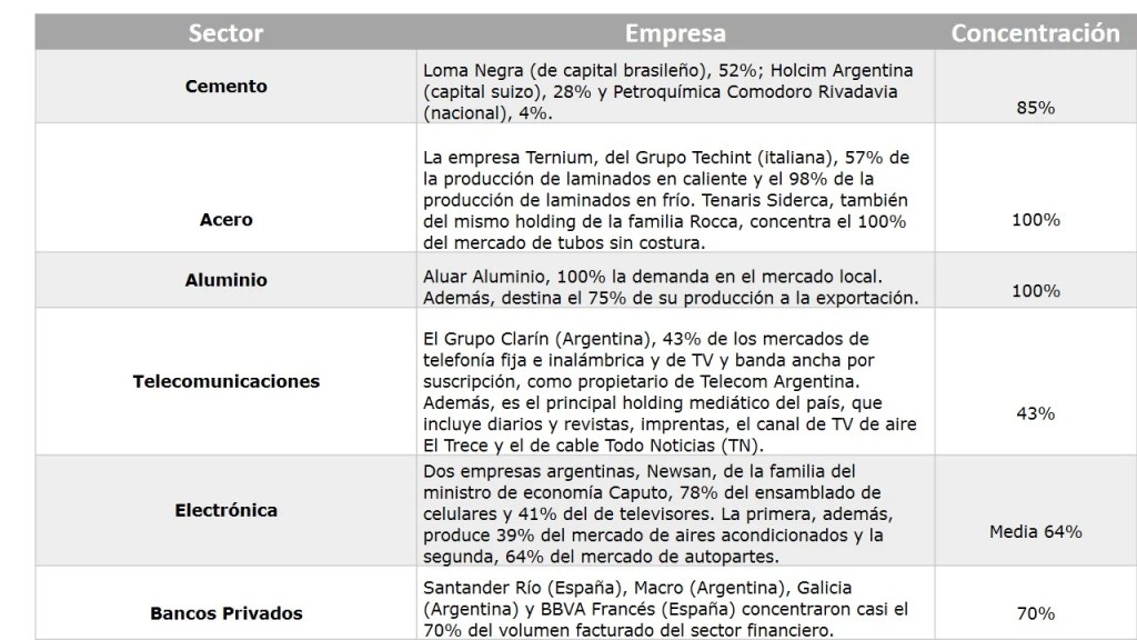 Solo 10 empresarios poseen 27 de las 80 firmas de mayor facturación de Argentina y concentran el 35% de las ventas. La producción de telecomunicaciones, cemento, aluminio, siderurgia, electricidad, hidrocarburos, electrónica y alimentos están dominadas por escasos conglomerados.
