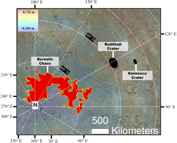 Proyección polar de la región norte de Mercurio, destacando las ubicaciones geográficas de BC, el cráter Raditladi (Figura 2 (A)) y el cráter Eminescu (Figura 6 (A)). Esta imagen consiste en un DEM global de MESSENGER Mercury (~665 m px-1) colocado sobre un mapa base global del Sistema de imágenes duales de Mercurio (MDIS) MESSENGER (~166 m px-1; cortesía de NASA/JPL/GSFC).