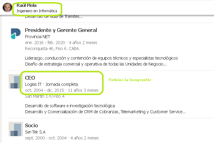 Raúl Piola hizo un burdo maquillaje en su cuenta de Linkedin para asegurar que, cuando él asumió su puesto en el Banco Provincia nada tenía que ver con LOGISIS IT, expresando que su ciclo había terminado en diciembre de 2015.