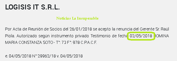 Como dijimos más arriba, el proceso de la Contratación Directa de LOGISIS IT comenzó en abril de 2018. Un mes más tarde se publica en el Boletín Oficial que, a través de un testimonio de fecha 2 de mayo, Raúl Piola, convenientemente, había renunciado a la Gerencia de la empresa en enero de 2018 (que ni siquiera cierra con su Linkedin).