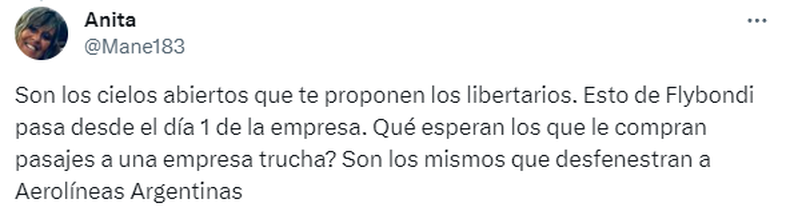 «Son los cielos abiertos que te proponen los libertarios. Esto de Flybondi pasa desde el día 1 de la empresa. Qué esperan los que le compran pasajes a una empresa trucha? Son los mismos que defenestran a Aerolíneas Argentinas», agregó otro usuario.