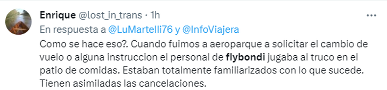 «Cuando fuimos a aeroparque a solicitar el cambio de vuelo o alguna instrucción el personal de Flybondi jugaba al truco en el patio de comidas. Estaban totalmente familiarizados con lo que sucede. Tienen asimiladas las cancelaciones», reflejó un tercer usuario.