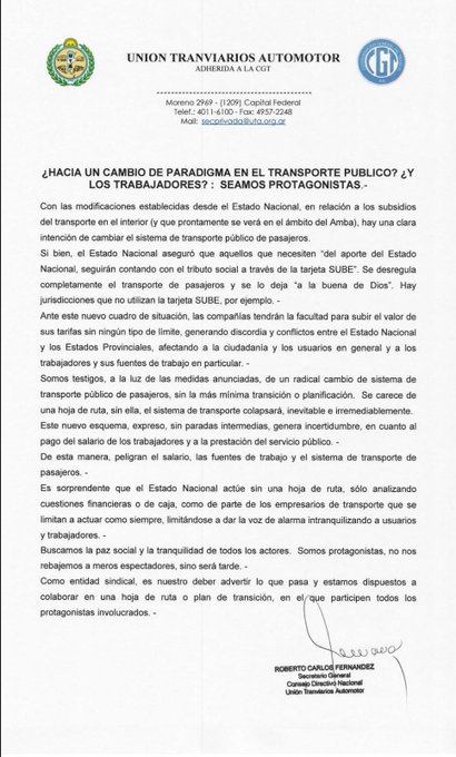 «De esta manera peligran el salario, las fuentes de trabajo y el sistema de transporte de pasajeros», denunció en el documento firmado por el secretario general de UTA, Roberto Carlos Fernández, en el que también planteó: «Como entidad sindical, es nuestro deber advertir lo que pasa y estamos dispuestos a colaborar en una hoja de ruta o plan de transición, en el que participen todos los protagonistas involucrados».