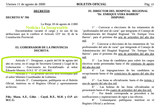 Cuestiones de gestión, y del corazón, han sabido poner en las últimas horas en la primera plana de los portales el nombre de «Lule» Menem, que fue oficializado hoy, a través del Boletín Oficial, por el Decreto 165/2024, desde el pasado 19 de febrero, «en el cargo de Subsecretario de Gestión Institucional de la SECRETARÍA GENERAL de la PRESIDENCIA DE LA NACIÓN». Trabajará así, codo a codo, con la hermana presidencial, Karina Milei, a la cual (en dichos de Jorge Rial) corteja con éxito.