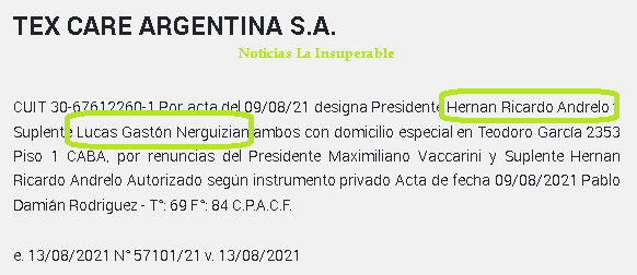 En cuanto a Tex Care SA, la última acta de Directorio publicada es de agosto de 2021, cuando se nombró presidente al hijo del dueño y socio fundador de Lavadero ANCA, Hernán Ricardo Andrelo, y a su primo, hijo del Presidente de ANCA, Lucas Gastón Nerguizian.