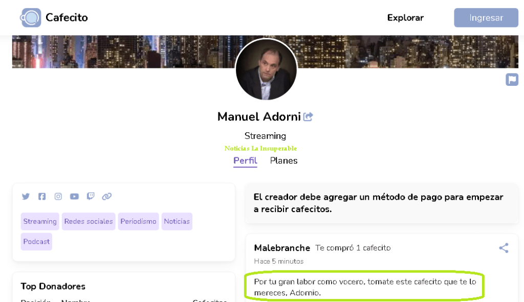 Manuel Adorni, actualmente, tiene abierta una cuenta por la cual recibe estas colaboraciones, principalmente en reconocimiento a su labor como Vocero presidencial, tal cual puede leerse en los mensajes que le dejan luego de donar.