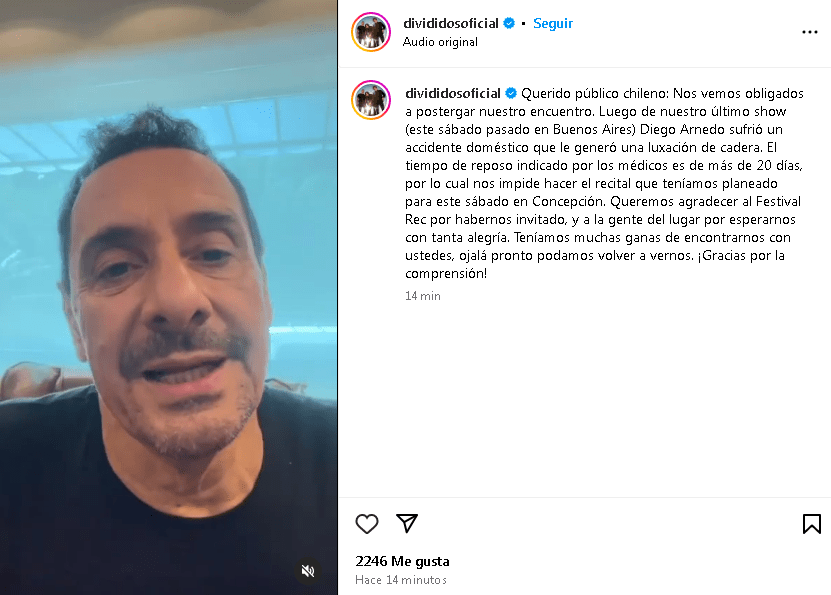 «Querido público chileno: Nos vemos obligados a postergar nuestro encuentro. Luego de nuestro último show (este sábado pasado en Buenos Aires) Diego Arnedo sufrió un accidente doméstico que le generó una luxación de cadera. El tiempo de reposo indicado por los médicos es de más de 20 días, por lo cual nos impide hacer el recital que teníamos planeado para este sábado en Concepción. Queremos agradecer al Festival Rec por habernos invitado, y a la gente del lugar por esperarnos con tanta alegría. Teníamos muchas ganas de encontrarnos con ustedes, ojalá pronto podamos volver a vernos. ¡Gracias por la comprensión!».