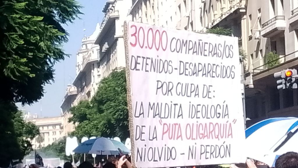 «El Gobierno viola todos los pactos internacionales», expresó. «Queremos a los represores presos, las condenas deben ser de cumplimiento efectivo», exigió. En tanto, Taty Almeyda aseguraba: “Tenemos 30 mil razones para defender la patria”.