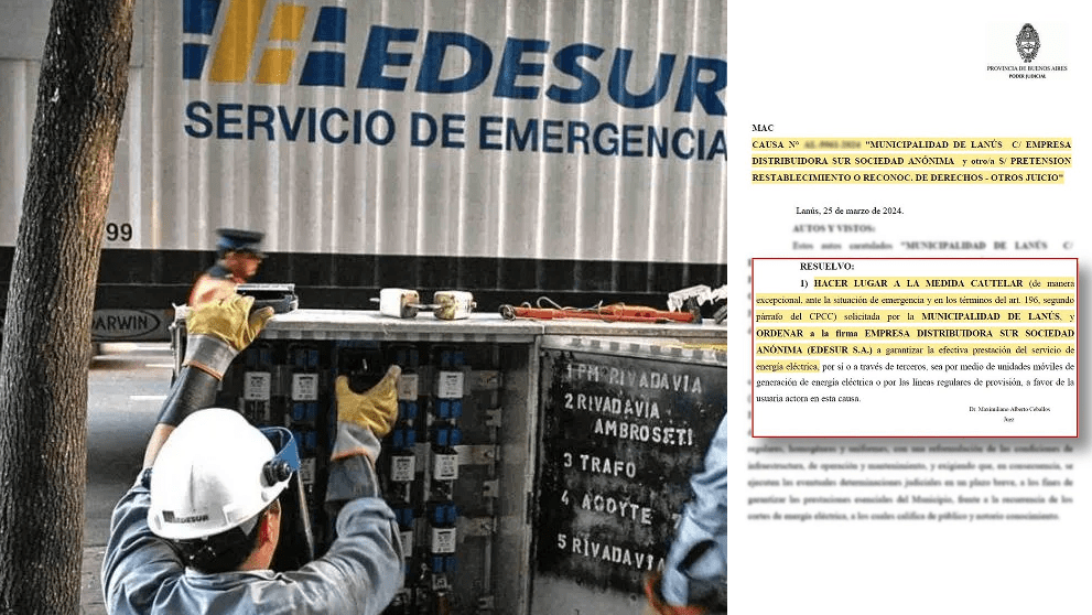 En un fallo sin precedentes, tras la demanda presentada por Lanús Gobierno, en manos del camporista Julián Álvarez, esta mañana el Juzgado en lo contencioso administrativo Nº1 de Lanús sentenció “hacer lugar a la medida cautelar solicitada por la Municipalidad de Lanús, y ordenar a la firma Empresa Distribuidora Sur Sociedad Anónima (EDESUR S.A.) a garantizar la efectiva prestación del servicio de energía eléctrica, por sí o a través de terceros, sea por medio de unidades móviles de generación de energía eléctrica o por las líneas regulares de provisión, a favor de la usuaria actora en esta causa.”