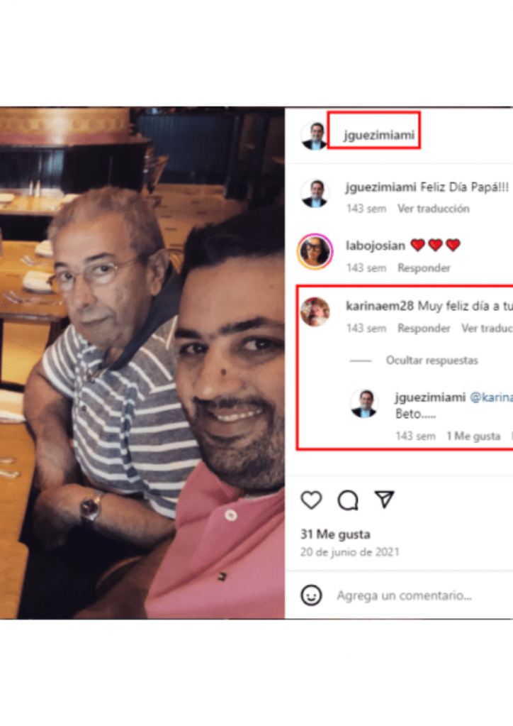 Guezikaraian y los Milei se conocen y son muy amigos. En sus cuentas de Instagram, el millonario financista @jguezimiam y  Karina Milei @karinaem28 se siguen mutuamente. Y por allí, la “Jefe” le manda emotivos saludos. Uno de ellos, para el día del padre del 20 de junio del 2021. “Muy feliz día a tu papá, Javi, besos”, comentó Karina, en un posteo que el financista sale con su padre, con emoticones de corazón. A lo que su socio y seguidor, le respondió “gracias, igualmente para ‘Beto’” por el colectivero Norberto Milei.