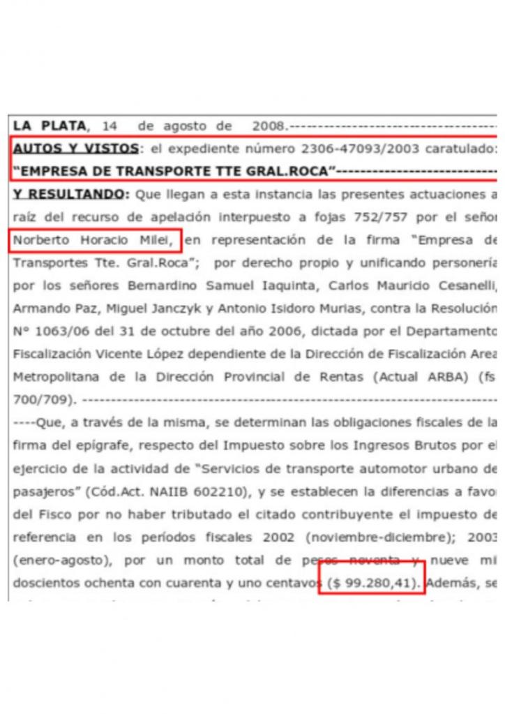 En el 2003, por evasión a los Ingresos Brutos por 99 mil pesos con su empresa Teniente General Roca S.A., Norberto Milei fue llevado a los tribunales por ARBA (Agencia de Recaudación Provincia de Buenos Aires) mediante el expediente 2306-47093/2003, apelado una y otra vez hasta el 2008 por Milei.