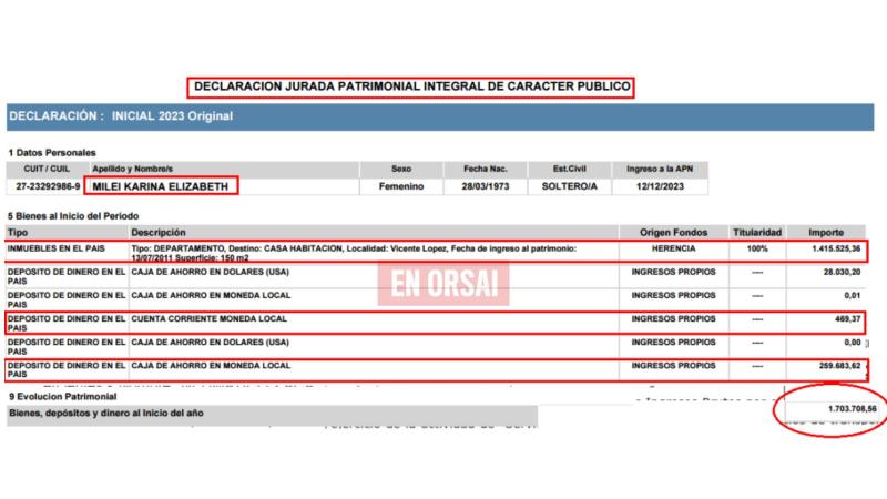 Todo lo anterior tiene como corolario el grosero dibujo llevado en sus Declaraciones Juradas de Bienes presentadas ante la Oficina Anticorrupción cuando Javier y Karina asumieron como presidente y secretaria Gral. de la Presidencia. Donde ambos se mostraron como unos pobres gauchos, conforme al relato electoral de Caputo, para no parecerse en nada a “la casta”.