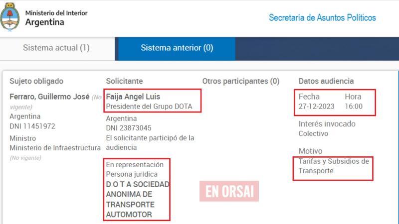 Estaban tan contentos los muchachos de DOTA S.A con este DNU, que según el Registro Único de Audiencias de la Nación, una semana después, el 27 de diciembre a las 16 horas, Angel Luis Faijá, CEO principal de DOTA, fue a la Casa Rosada a entrevistarse con el ministro de Infraestructura libertario Guillermo Ferraro. Según los registros, la audiencia, solicitada por el propio Faijá, socio del padre de Mieli, fue para hablar de “tarifas y subsidios de transporte”. Un tema vital para su empresa.