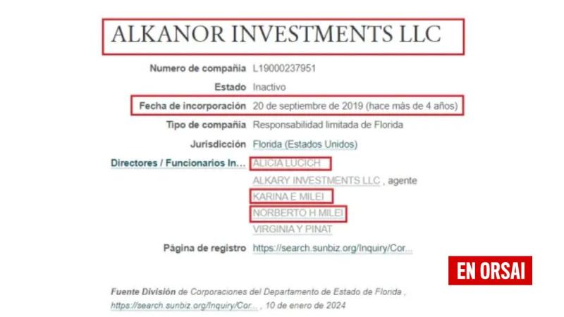 Otra de las offshore fundadas fue ALKANOR INVESTMENTS LLC (por Alicia, Karina y Norberto) constituida también por Karina y sus padres en Miami, Estados Unidos, el 20 de septiembre del 2019, mientras el país, sobre el final del gobierno de Macri, se hundía en la crisis. En esta sociedad al igual que ALKARY, figura como socio también el ¿financista? ¿prestanombre? argentino Javier Guezikaraian. Un argentino ultra mileista radicado en Miami dueño de otras 14 empresas offshore. Algunas con la misma dirección que la de los Milei.