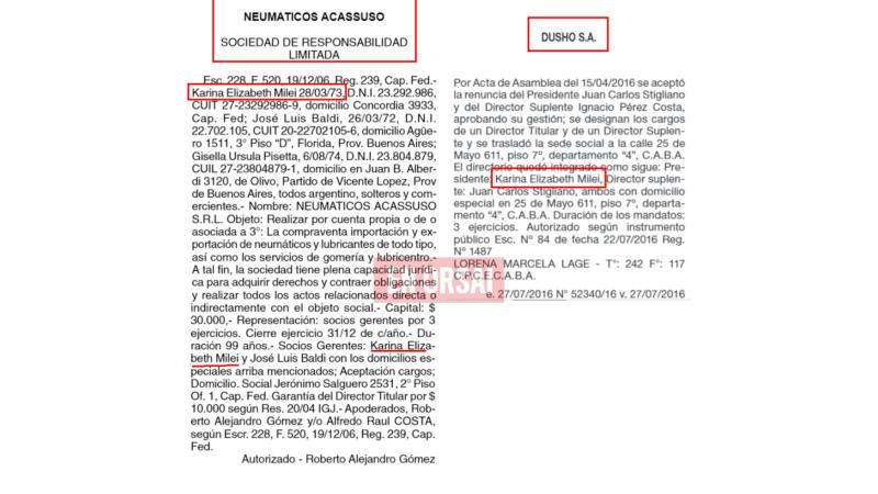 Por su parte, Karina Milei, licenciada en Relaciones Públicas, inscripta en la AFIP como monotributista prestadora de “servicios personales”, fundó en enero del 2007, la empresa Neumaticos Acassuso S.R.L. Dedicada a la  “compraventa importación y exportación de neumáticos y lubricantes de todo tipo, así como los servicios de gomería y lubricentro”. Actividad que nada tiene que ver con su profesión aunque sí con la de su padre. Dado que seguramente esta firma provee neumáticos, lubricantes y servicios a los colectivos de DOTA S.A. Integrando así aún más su negocio.
