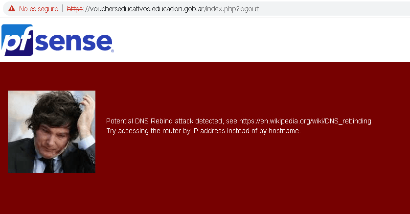 El sitio oficial arroja un mensaje sobre un posible ataque de DNS Rebind detectado. La revinculación de DNS o DNS rebinding es un ataque informático basado en DNS donde el atacante aprovecha una vulnerabilidad para transformar el equipo en un proxy de red.