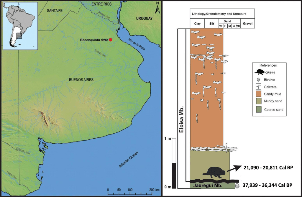 El descubrimiento sitúa la llegada de los primeros pobladores al continente hace 21 mil años atrás, 5 mil años antes de lo que se creía. El estudio, que aporta la primera evidencia de interacción entre humanos y megafauna en el Cono Sur, fue realizado por investigadores del CONICET y el Museo de La Plata. El hallazgo tuvo lugar a orillas del río Reconquista, provincia de Buenos Aires.