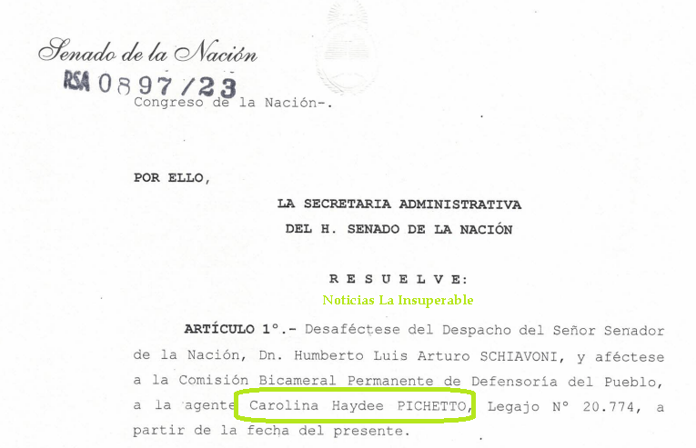 Pocos días antes de que esto suceda, y una semana previa al balotaje que ya había dejado fuera de competencia a Juntos por el Cambio, Pichetto volvió a sacudir la varita y logró el pase de su hija, efectivizada con la RSA0897/23, desde la oficina de Schiavoni a la fantasmagórica Comisión Especial Bicameral de la Defensoría del Pueblo.
