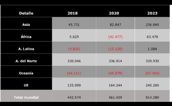 Superávit comercial de China por región (en millones de dólares)