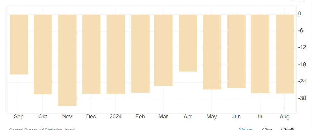 Antes del estallido de la guerra, se preveía que la economía de Israel crecería en 2023 un 3,5%. Al final el PBI aumentó sólo un 2%, es decir, cayó 1.5%, y se proyecta para 2024 una retracción a solo el 1.6%. Este declive ha sido leve porque se evitó una caída aún más pronunciada gracias al importantísimo sector tecnológico del país, que en gran medida no se ha visto afectado por los combates. La confianza del consumir muestra un nivel extrañamente bajo, pero no es sólo el consumo, las ventas minoristas, sino la balanza comercial deficitaria, las exportaciones y hasta las remeses han tenidos caídas estrepitosos, así como la recaudación tributaria que se ha detenido en seco.