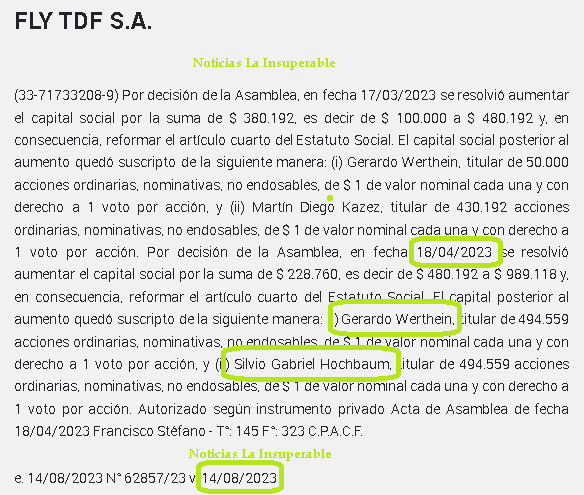 Lo curioso, por no decir delictivo, es que en los papeles que autoriza el ENACOM falta un jugador. Como habíamos señalado más arriba, más alla de Majul, están los socios de FLY TDF, Gabriel Hochbaum y Gerardo Werthein, que se hicieron entre marzo y abril de 2023 con el capital accionario en partes iguales, lo cual fue publicado en el Boletín Oficial de 14 de agosto de 2023 y, evidentemente, fue lo presentado por los socios de Majul ante las autoridades del ENACOM.