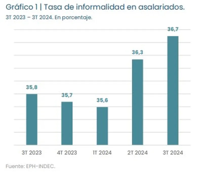 Los datos surgen del último «Panorama del empleo asalariado informal y la pobreza laboral» elaborado por el Área de Empleo, Distribución e Instituciones Laborales (EDIL) del Instituto Interdisciplinario de Economía Política (IIEP), que señaló que la tasa de informalidad entre los asalariados fue de 36,7% en el tercer trimestre de 2024.